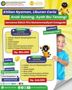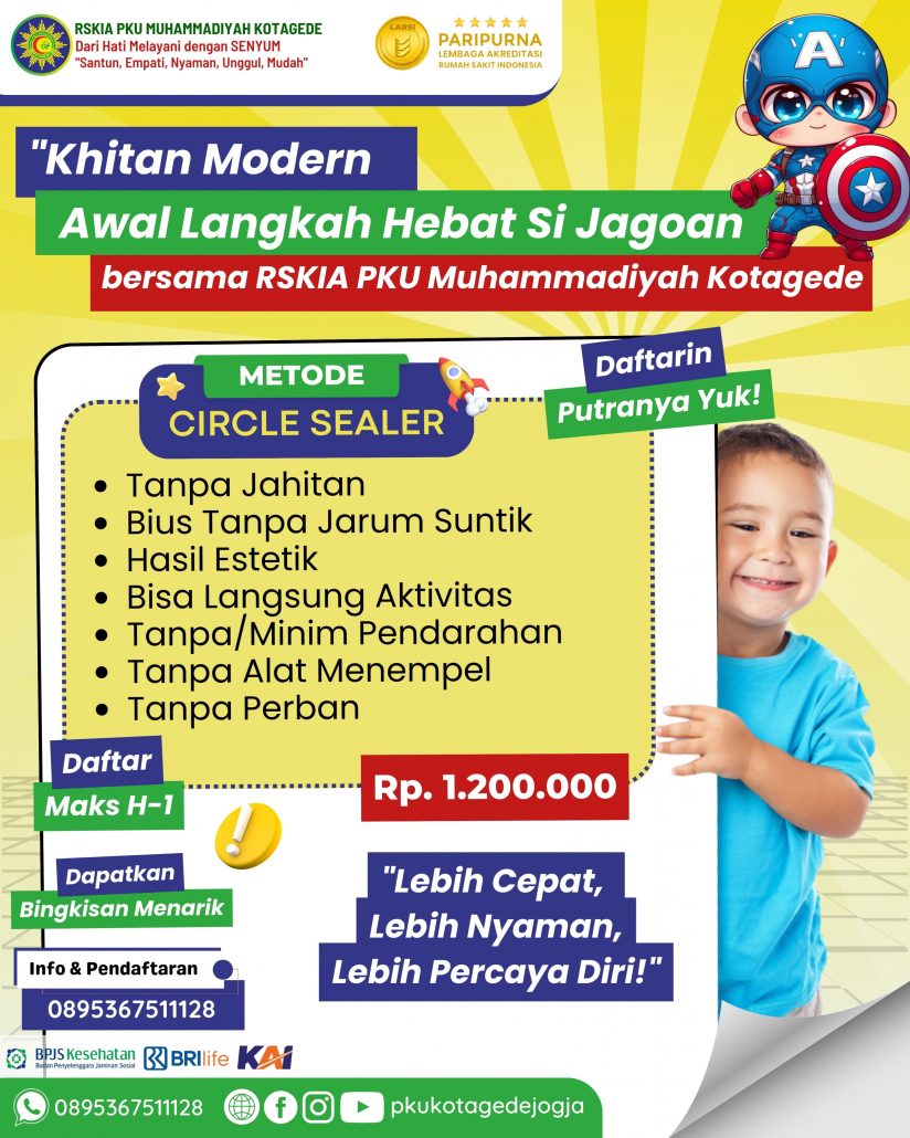 Liburan segera tiba, yuk Sunat di RSKIA PKU Muh Kotagede, karena banyak pilihan paket Khitan yang tersedia, dan tentunya dengan harga yang terjangkau. Segera reservasi ke nomor 0895367511128